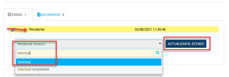 - Después, cambiar al siguiente ESTADO (2): SOLICITUD