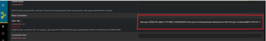 Enter the HANA JDBC connection URL in the JDBC URL field. Then, in the text editor area, paste the following JSON configuration. Replace the placeholder values with your actual environment information: