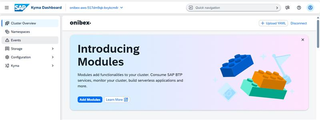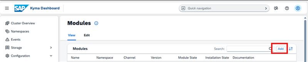 In Kyma Dashboard → Modules → Modify Modules → Add, add all five modules listed below: