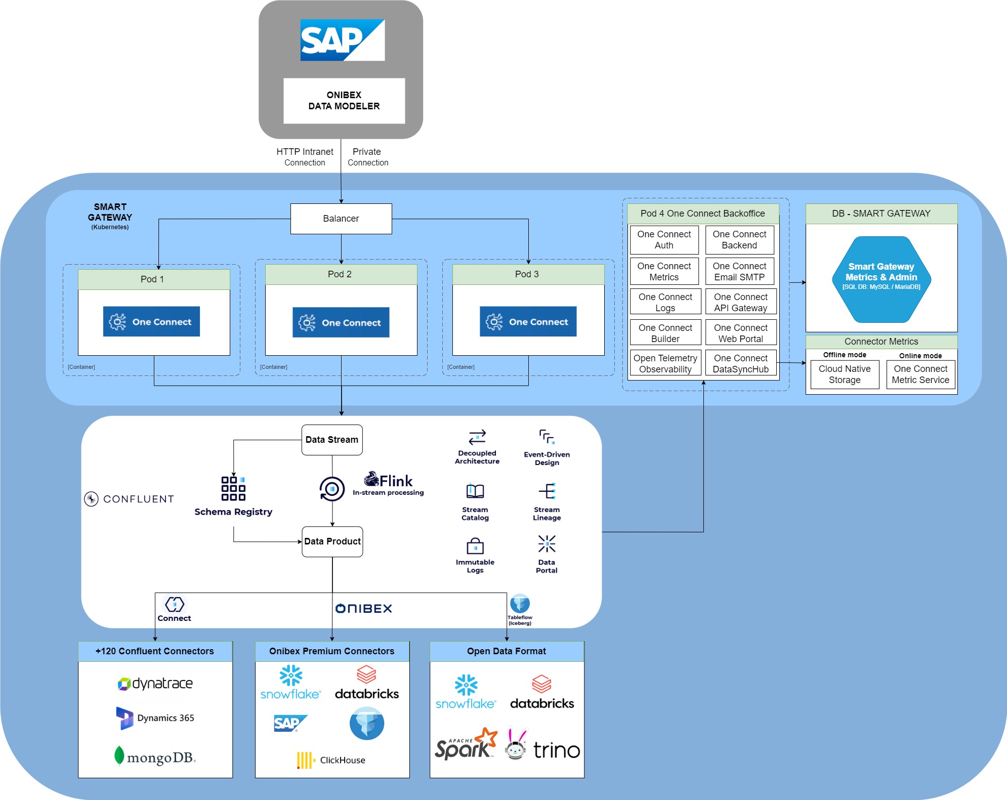 The diagram below illustrates the high-level architecture of the OneConnect solution. It depicts SAP ECC or S/4HANA as the data producer, with multiple downstream systems—such as ClickHouse, Snowflake, and Databricks—acting as subscribers. Other destinations can also be supported.