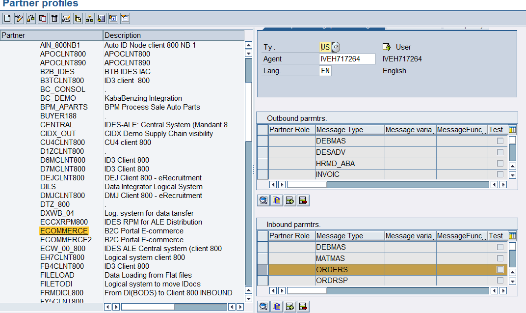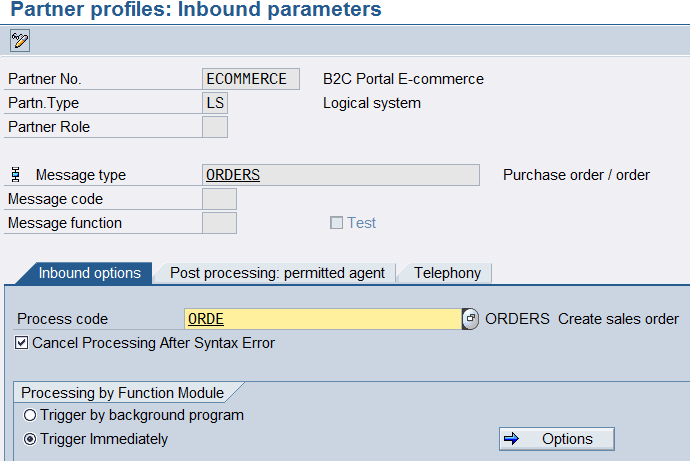 In SAP, the configuration of ORDERS iDOC begins in transaction WE20, on the Logical Systems part as an Inbound message, as described in the screen from Figure-87.