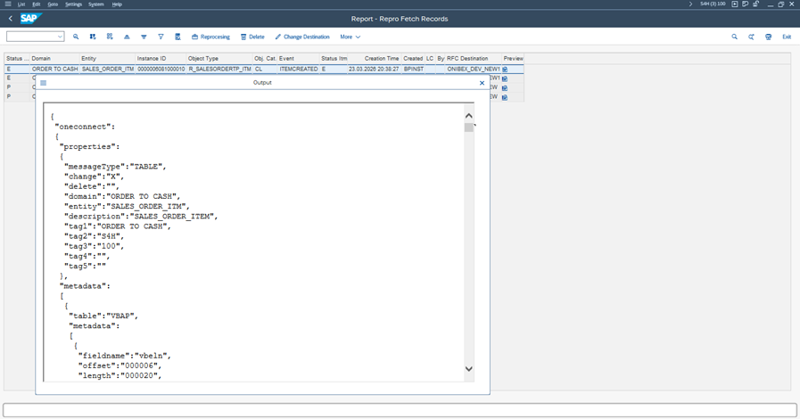 - Executing Reprocess: Once the JSON has the correct destination and is verified for resubmission, select the row and click the "Reprocessing" button. Upon a successful execution, the status will change from E to R, and a reprocessing date will be assigned.