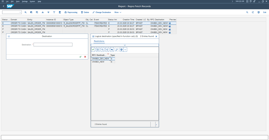 - Modifying RFC Destination: To change the destination, select the row of the JSON you want to reprocess and click the "Change Destination" button in the menu. You can either enter it manually or search for it.