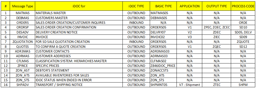 These are the main messages that are exchanged through iDOCs documents. As per the table  in Figure-16, each message type has its own configuration parameters, even when filling the same sections in the same SAP formats, as it is the same "Partner profile", "Distribution model" and "Condition Record", among others.