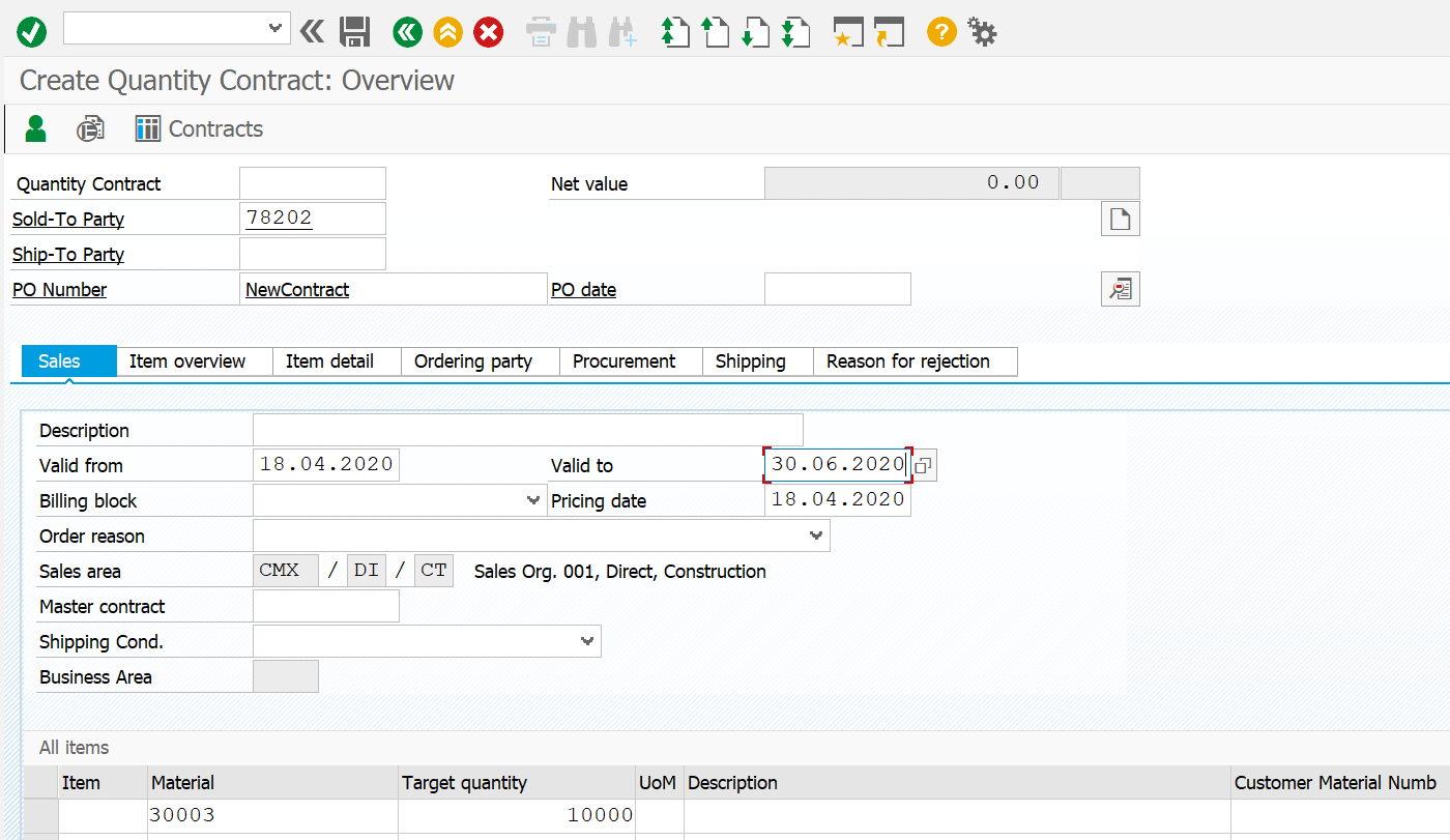 Figure-84: Create Contracts in VA41 transaction as Open Orders by Quantity.